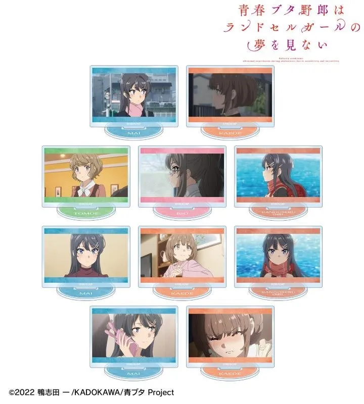 このスタンドには、桜島麻衣、梓川花楓、古賀朋絵、双葉理央といったキャラクターたちの印象的なシーンが描かれています。デスクやお部屋に飾ることで、日常生活にキャラクターとの親近感を感じられることでしょう。
