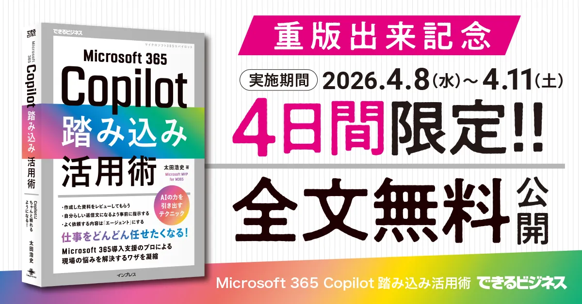 株式会社インプレスは、2026年1月に発売した書籍『Microsoft 365 Copilot踏み込み活用術(できるビジネス)』の重版を記念し、特別なキャンペーンを実施します。2026年4月8日(水)から4月11日(土)までの4日間、書籍の全文が無料で公開されるこの機会を見逃せません。