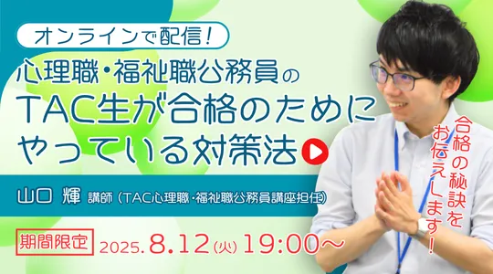 公務員試験を目指している皆さんに朗報です!TAC公務員が開催するオンラインセミナー『心理職・福祉職公務員の合格法-TAC生が合格のためにやっている対策法-』が2025年8月12日(火)19:00からYouTubeで限定配信されます。このセミナーは、心理職や福祉職を志望する方に向けて、合格のためのさまざまな対策を紹介する内容です。