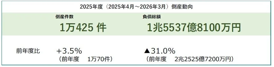 2025年度の企業倒産件数が1万425件に達し、前年に続いて1万件を超えるという厳しい結果が報告されました。この傾向は4年連続で前年を上回っており、特に物価高や人手不足が中小企業を直撃しています。以下に、詳細な分析をお届けします。