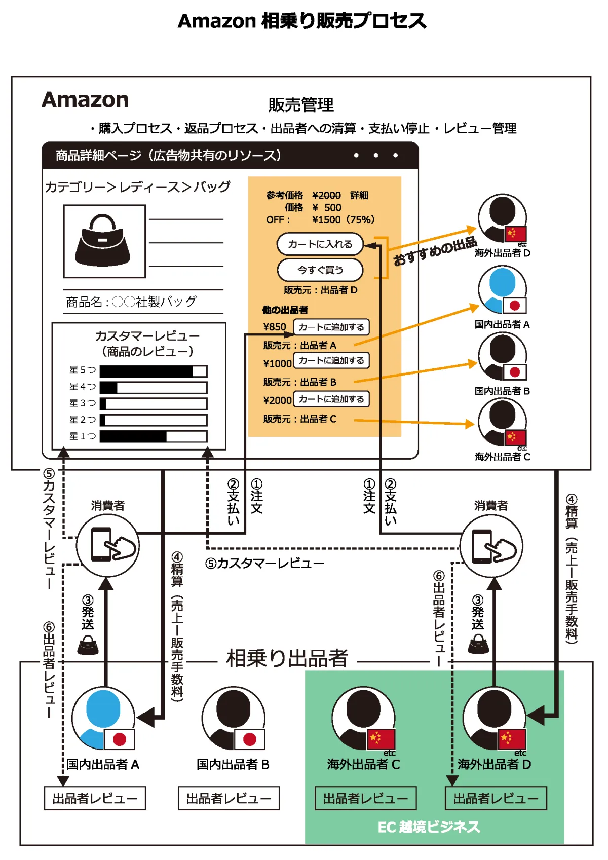アマゾンの相乗り出品制度は、同一商品を複数の出品者が一つのページに集約する仕組みを採用しています。このため、偽造品を購入した顧客が書き込んだ不適切な低評価が、正規商品にも影響を及ぼすという問題があります。例えば、他のECサイトでは、異なる商品のレビューは個別に管理されますが、アマゾンの場合、不正なレビューがすべての出品者に集約されてしまうのです。このため、正規の出品者やメーカーにも風評被害が及び、取引に深刻な悪影響を及ぼします。