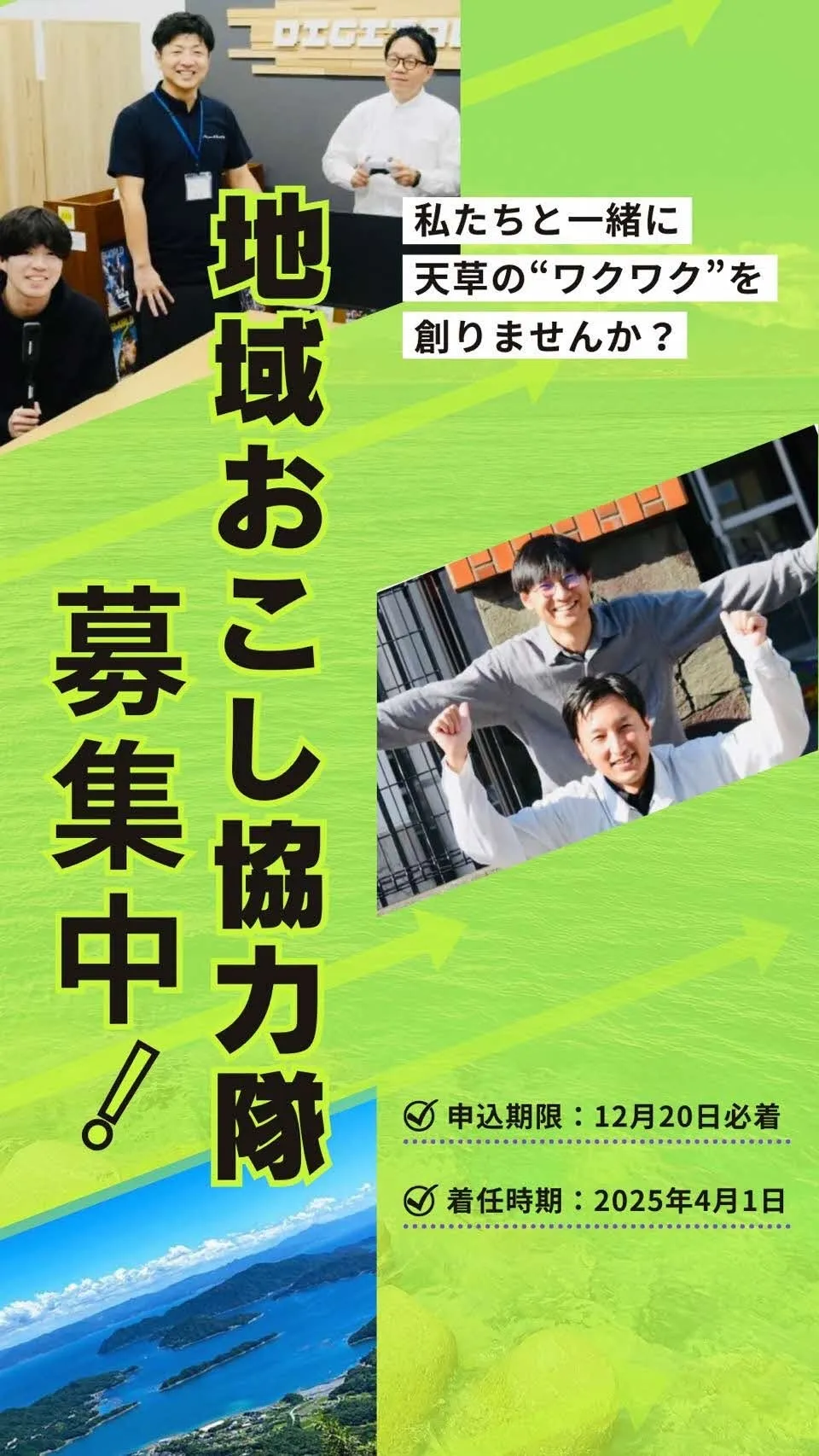 | 一般社団法人デジタルアート天草 | 正規社員 | 1名 | 令和7年4月1日から令和8年3月31日(最大3年まで更新可) | 月曜日~金曜日の週5日 | 10:00~19:00(休憩1時間) | 265,000円~350,000円 |