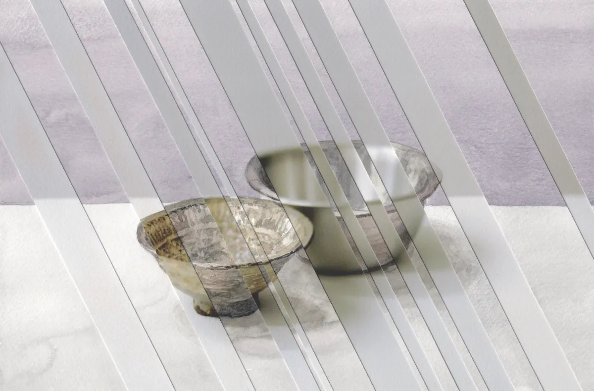 例えば、展示の一つである「Still Life, Antique Bowl and Stainless Steel Bowl」は、19.6×30cmのサイズで、写真と水彩という異なるメディアを用いて構成されています。城田は、肉眼で捉えた対象を写真に取り、次にその同じ視点から絵を描くという工程を踏むものの、最終的にはこれらを切り貼りし、独自の視覚環境を創り上げていきます。