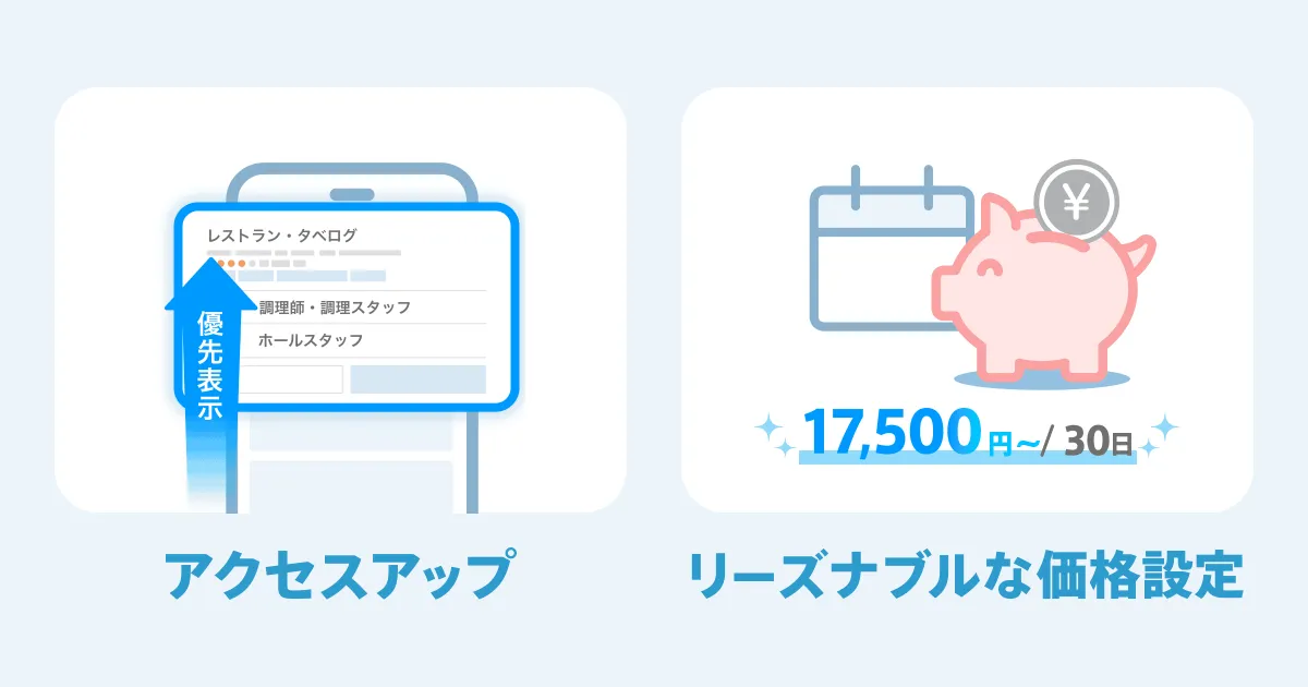 新たに提供される有料掲載サービスでは、飲食店が効率よく人材を採用できるように求人情報を検索結果で上位に表示することを主な機能としています。このサービスは「チケット制」を採用しており、月額固定費を課さずに利用可能です。料金は適用される割引によって異なりますが、1枚あたり17,500円(税別)から購入でき、採用に合わせて自由に利用できます。さらに、1店舗あたり30日間優先的に求人情報が表示され、複数のチケットを同時に使用することで注目度をさらに増すことも可能です。