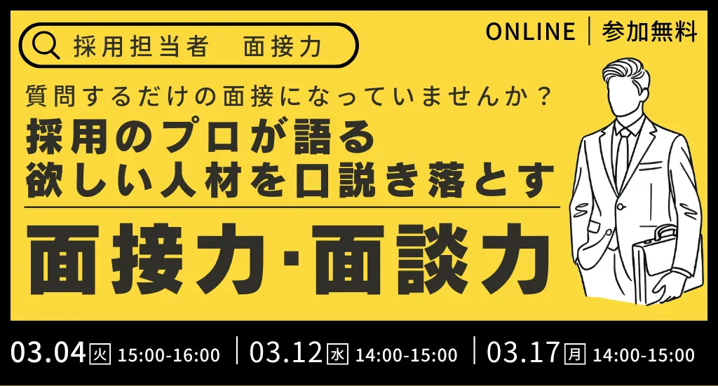 採用活動が厳しい状況にある中小企業や知名度の低い業界で、他社に埋もれないためには、面接の質を高めることが必要です。本セミナーでは、採用のプロである芳崎 弘昂氏が、選考プロセスにおける面接力及び面談力を磨くための具体的な手法を伝授します。特に、候補者を魅了し、自社の魅力を伝える技術が必要です。