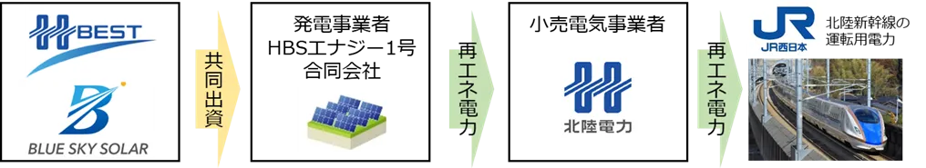 2024年8月、北陸電力の完全子会社である北陸電力ビズ・エナジーソリューション株式会社(通称:北電BEST)とブルースカイソーラー株式会社が、合同会社「HBSエナジー1号合同会社」を設立しました。この新たな組織は、合計約15,000kWの太陽光発電所を開発し、生成された再生可能エネルギー由来の電力を、北陸新幹線に供給することを目的としています。