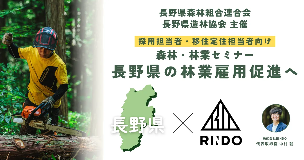 株式会社RINDOが主催する長野県の「森林・林業セミナー」に登壇することになりました。これは、長野県森林組合連合会と長野県造林協会が協力して実施するイベントで、林業業界の採用担当者や移住定住に関心のある方々を対象としています。このセミナーは、地域の雇用管理や林業の活性化を目的としており、RINDOの代表である中村就が登壇し、林業界におけるWEB採用活動の動向や人材採用戦略についてお話します。