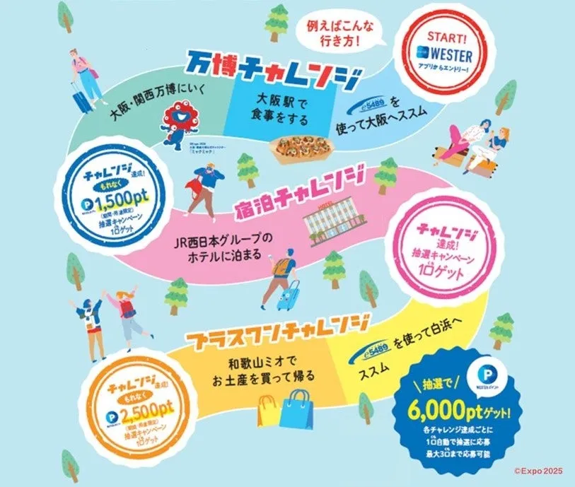 このキャンペーンの目玉は、特定の条件をクリアすることで、Westerポイントがもらえるというものです。JR西日本の新幹線や特急列車を予約して利用し、万博関連のチェックインや対象店舗での買物などを通じてポイントをゲットするチャンスがあります。