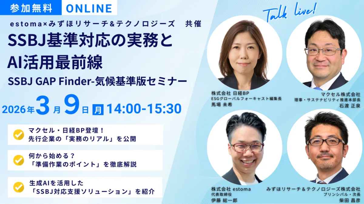 企業のサステナビリティへの対応が求められる今、株式会社estomaが主催となり、みずほリサーチ&テクノロジーズと共に2027年から義務化されるSSBJ基準に関するオンラインセミナーを開催します。このセミナーは、業務提携先の専門家たちが集まり、最新のAI技術を駆使した実務対応について議論を交わします。