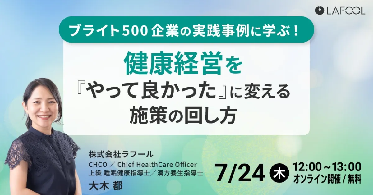 株式会社ラフールは、2025年7月24日(木)に、「ブライト500企業の実践事例に学ぶ!健康経営を「やってよかった」に変える施策の回し方」と題した専門セミナーをリモート形式で開催します。このセミナーでは、健康経営の重要性を理解し、実際に成果を上げている企業の成功例に基づいた具体的な取り組みについて紹介します。