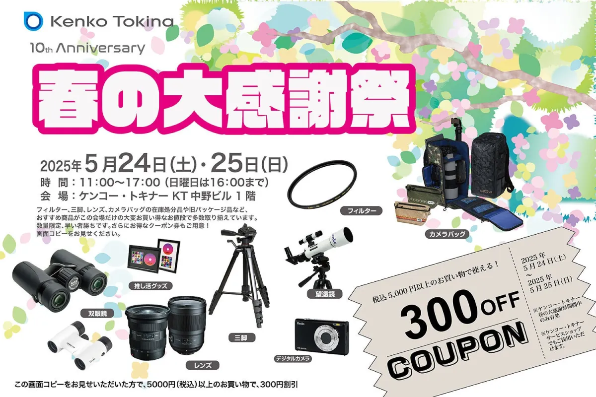 2025年5月24日(土)と25日(日)、ケンコー・トキナーが主催する『春の大感謝祭』が東京都中野区のKT中野ビルで行われます。このイベントでは、特に注目すべきは双眼鏡の体験会です。専門のスタッフが親切に、コンサートやバードウォッチングなど、さまざまな用途に合った機種の使い方を教えてくれます。話題の防振双眼鏡も用意されており、普段使っているものと比較する良い機会となるでしょう。