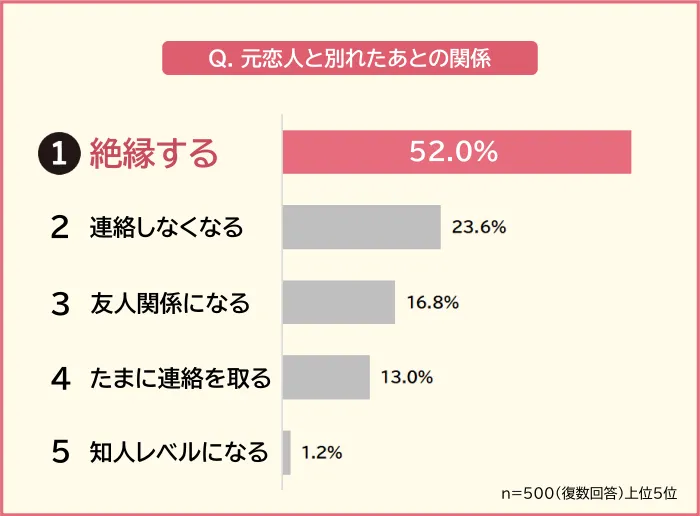 - - 元恋人とは別れたあとの最も多い選択肢: 「絶縁する」(52.0%)