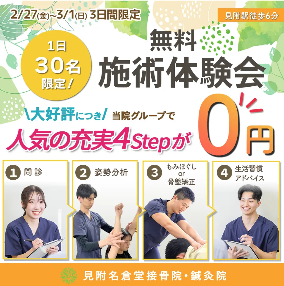 新潟県見附市にある見附名倉堂接骨院・鍼灸院では、来る2月27日から3月1日までの3日間、初回0円の無料施術体験会を開催します。このイベントは特にデスクワークの多い方や、腰や肩の痛みを感じている方にぴったりの機会です。この機会に、お身体の状態を見直してみませんか?
