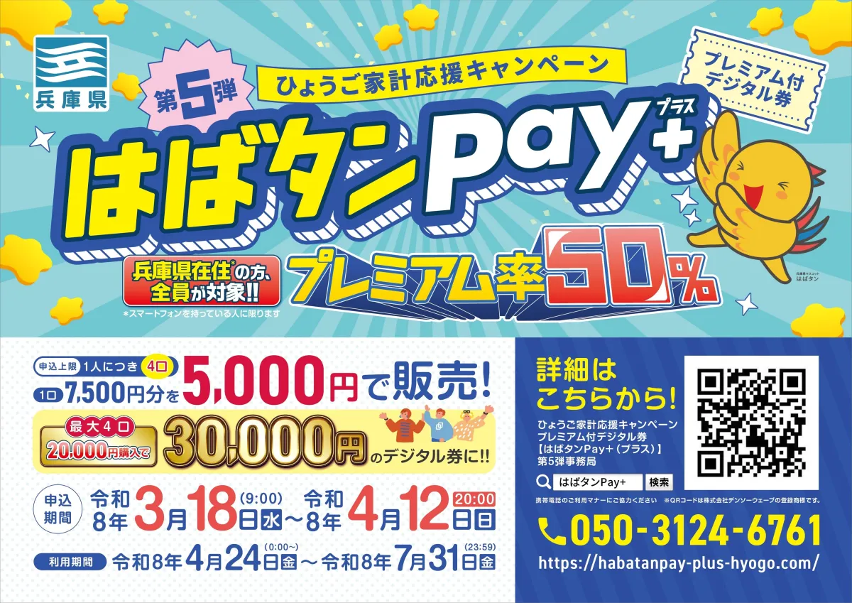 - - 名称:「ひょうご家計応援キャンペーン プレミアム付デジタル券はばタンPay+第5弾」