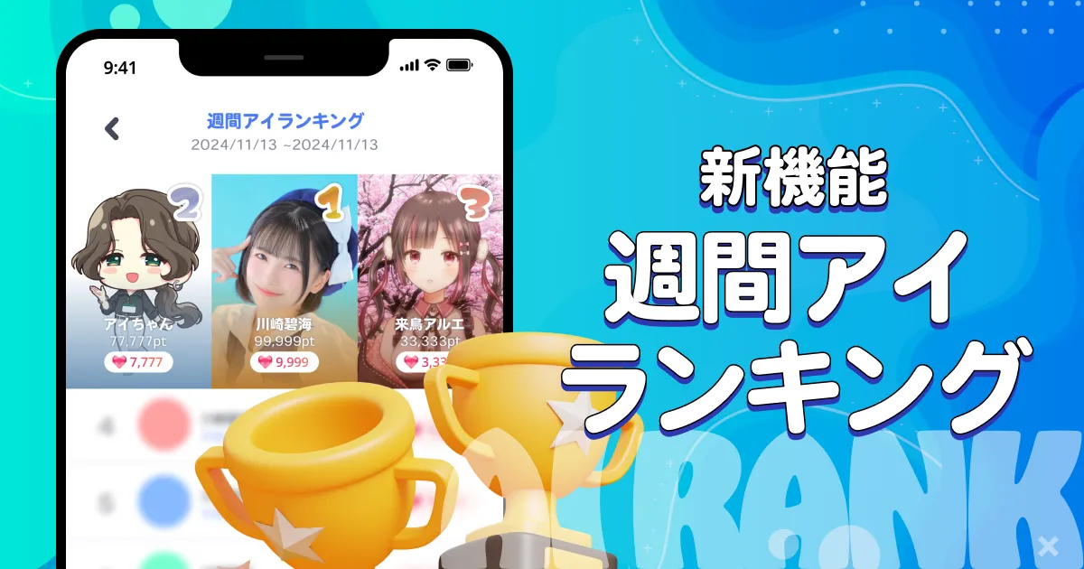 「アイランク」機能では、アイの人気度を「S / A / B / C / D / E」の6段階に分けることで、クリエイターは自身のアイの評価を明確に把握できます。アイランクが高いほど、週間ランキングで得ることができる報酬も増加するため、クリエイターはファンとの関係をより一層深めることが可能になります。このシステムは、クリエイターとファンの双方にとって有益な新たなエコシステムを構築することを目指しています。