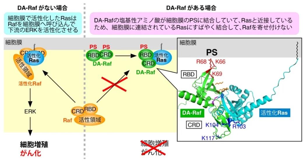 研究グループは、DA-Rafが細胞膜に含まれる脂質に結合することにより、がん促進シグナルを遮断する仕組みを明らかにしました。具体的には、DA-Rafが細胞膜に存在する脂質、特にホスファチジルセリン(PS)に結合することで、Rasに優先的に結びつき、Ras-ERK経路の働きを効果的に抑えることが分かりました。
