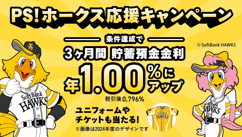 特別金利として、貯蓄預金金利が年1.00%(税引後0.796%)が3ヶ月間適用されます。また、期間中にプレミアムサービスに加入した方には抽選で名のあるホークス選手のサイン入りグッズもプレゼントされます。