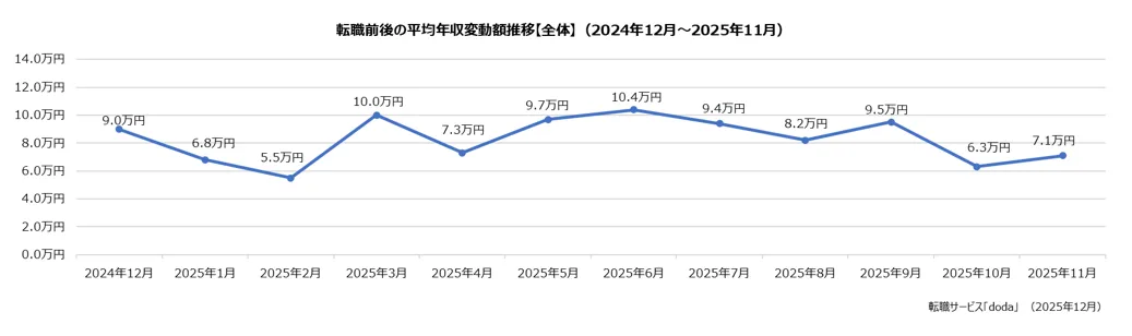 2025年11月版 doda転職前後の年収変動レポート