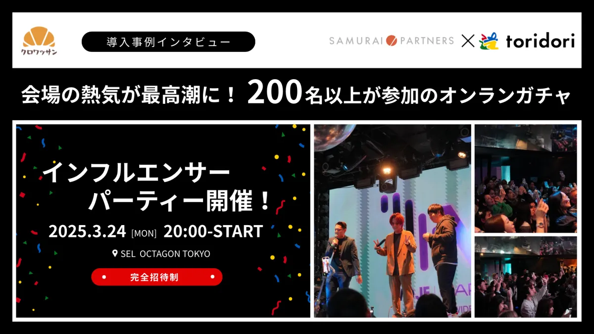 主催は、株式会社サムライパートナーズと株式会社トリドリの2社。このパーティーは、インフルエンサー同士の交流やスポンサー企業との接点作りを目的として行われました。このような大型パーティーでは、参加者が心から楽しめる企画が求められます。そこで、『クロワッサン』が選ばれた理由は「誰でも簡単に使える」という点にありました。