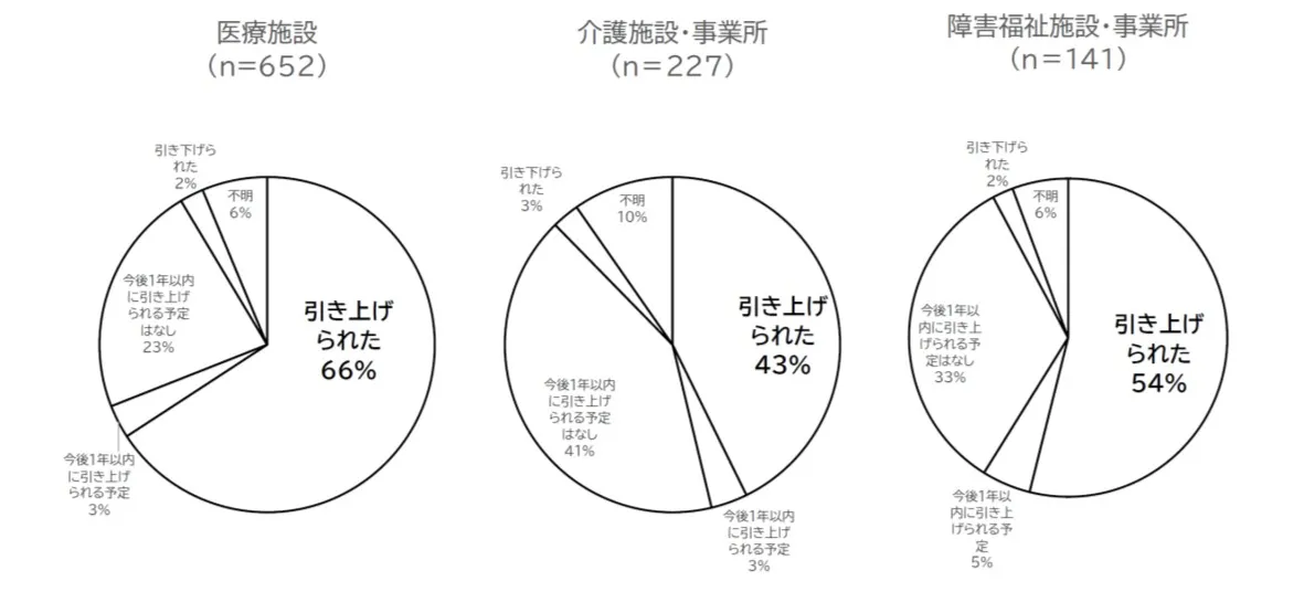 調査結果によると、リハビリテーション専門職の現金給与総額が引き上げられた施設は医療施設で66%、介護施設で43%、障害福祉施設で54%という結果でした。しかし、いずれの施設でも昇給が行われていない実態も見受けられ、医療施設の約3割、介護施設の約6割、障害福祉施設の約5割が給与引き上げを行っていないことが明らかとなりました。