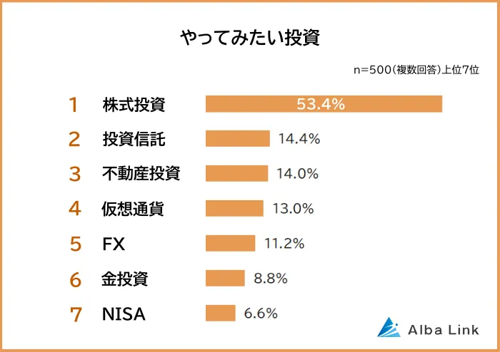 調査結果では、「株式投資」が53.4%を占めて1位となり、続いて「投資信託(14.4%)」「不動産投資(14.0%)」「仮想通貨(13.0%)」が続きました。これらの結果は、特に若い世代における投資の障壁が低くなりつつあることを示唆しています。