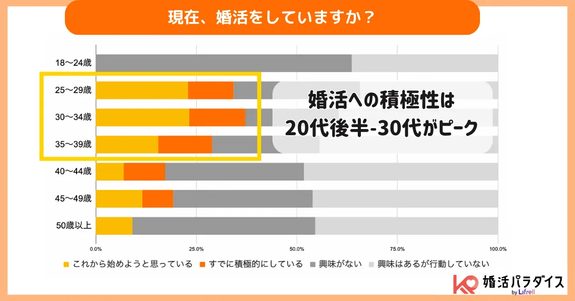 調査からは、婚活を始めたり検討したりする人々が20代後半から30代に多く集中していることが示されています。この世代は結婚適齢期とされ、仕事や生活設計においても重要な選択を迫られやすい時期です。特に、この年齢層では「これから婚活を始めようと思っている」との回答が多く見られました。