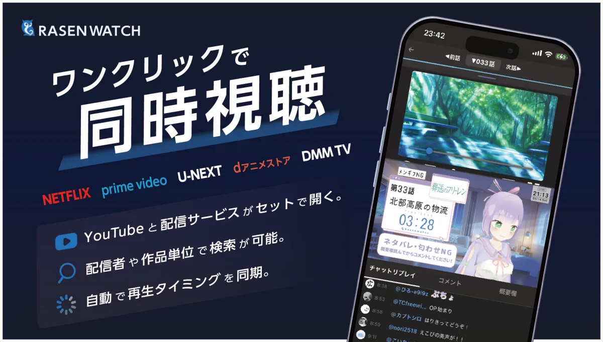 同時視聴とは、ファン同士や配信者との時間を共有し、感動や驚きをリアルタイムで分かち合う体験です。特に、アニメや映画の物語に没入する際、配信者のリアクションが楽しみの一部になることが多いです。これまでこの視聴スタイルは、PC版「RASENWATCH」が及び提供されていましたが、スマホ版の登場により、より多くの人々が気軽に享受できるようになりました。