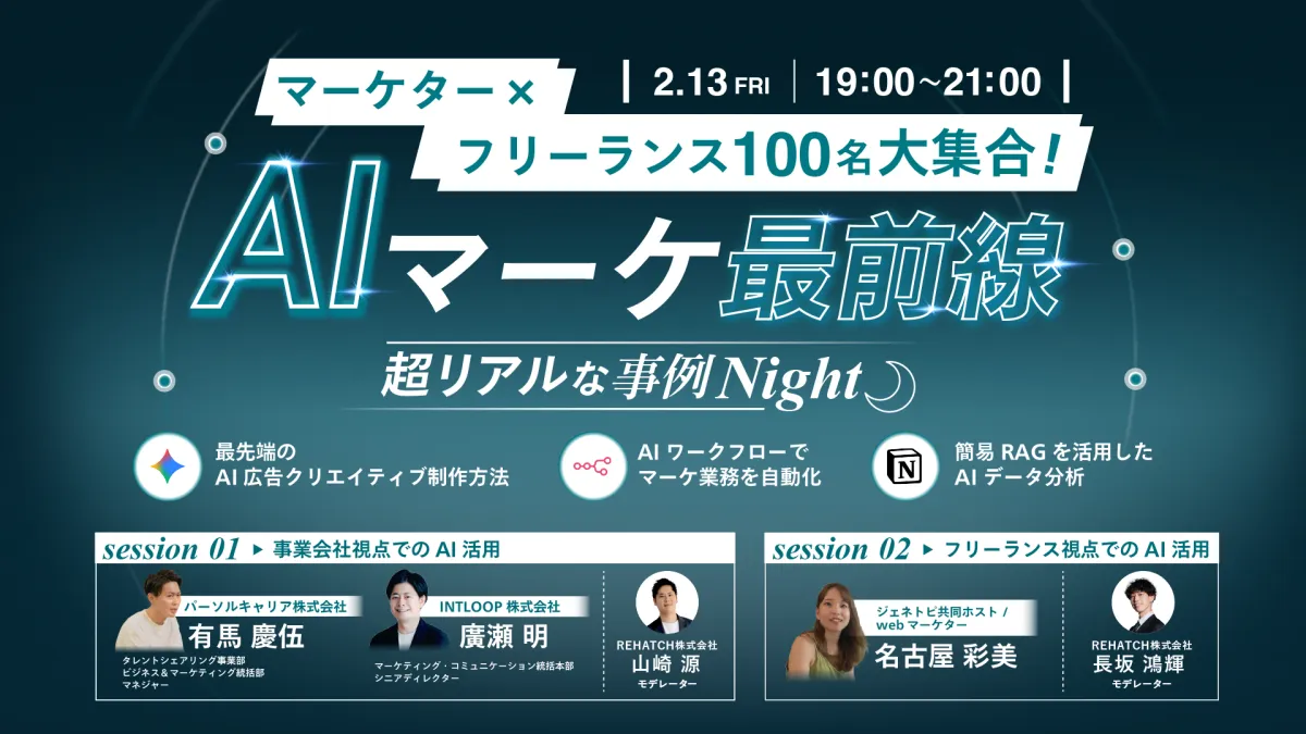 2026年に向けて、AI技術の進化がマーケティングの世界にもたらす変化は目覚ましいものがあります。最近、REHATCH株式会社が主催し、マーケターとフリーランサーの交流を目的としたイベント「AIマーケ最前線 -超リアルな事例Night-」が開催されることが決定しました。この特別な夜の詳細をお伝えします。