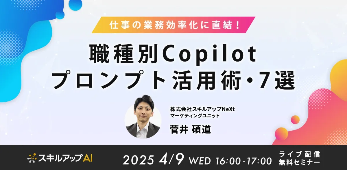 株式会社スキルアップNeXtは、2025年4月9日(水)に職種別のプロンプト設計を学ぶ無料オンラインセミナーを開催します。今回のセミナーでは、Microsoft 365 Copilotを業務に活用するための技術を身につけることができます。