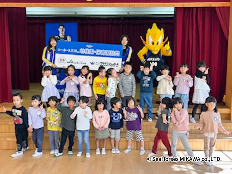 2024年11月11日、愛知県西尾市にある鶴城幼稚園を訪れたシーホース三河のイベントは、選手たちの明るい笑顔で溢れる楽しい一日となりました。チームのマスコットキャラクター、シーホースくんに加え、アイドルグループSuper GirlsのSAHOさんとTOMOMIさんも参加し、園児たちと共にクイズやダンスを楽しみました。