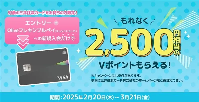 新生活を迎える皆さんに、三井住友カードからのお得なお知らせです。2025年の2月20日から3月20日までの期間、対象となる三井住友カードをお持ちの方が新たにOliveフレキシブルペイに入会すると、なんと2,500円相当のVポイントをプレゼントするキャンペーンが行われます。この機会に、キュートかつ便利なOliveフレキシブルペイを利用し、新しい生活をより快適に楽しんでみてはいかがでしょうか。