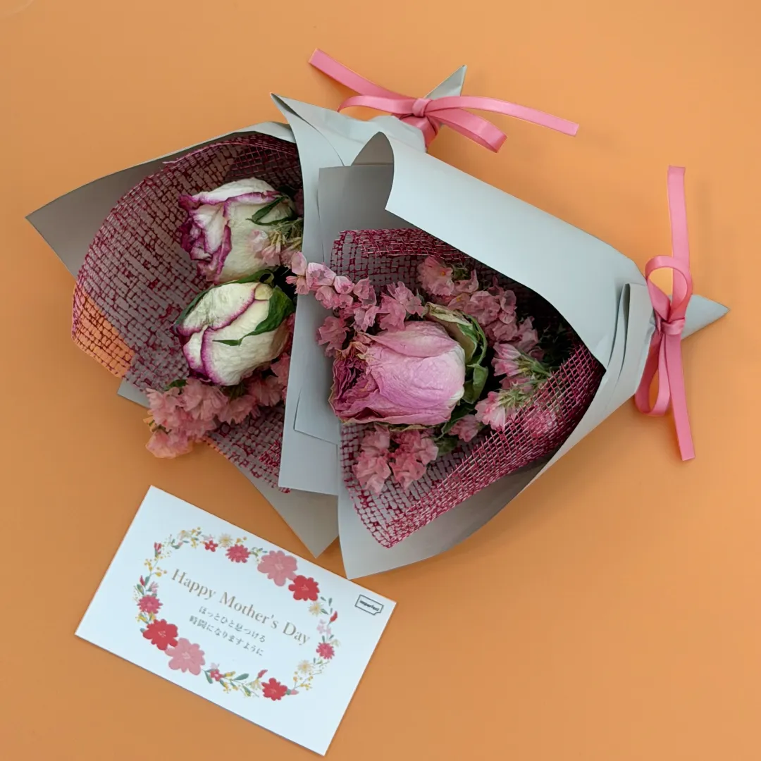 - - ロスフラワー®のミニブーケ:廃棄される運命にあった花々を再利用した、サステナブルなドライフラワーブーケです。毎回異なる花材を使用しているため、まさに一期一会の贈り物となります。これにより、環境への配慮と共に、心温まる彩りを加えることができます。