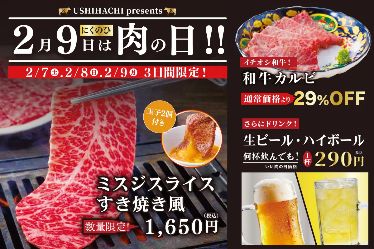 2026年2月7日(土)から9日(月)までの3日間、焼肉店「USHIHACHI」が年に一度の特別なキャンペーンを開催します。この期を逃すと味わえない限定メニューや破格の飲み物メニューがご用意されていますので、ぜひお見逃しなく!