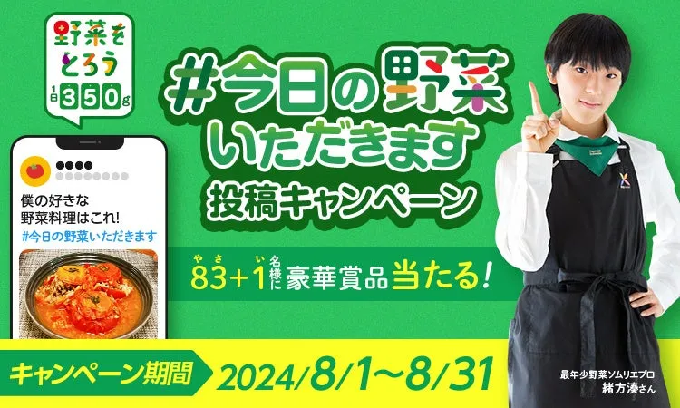 ユーザーに向けて、「今日のお野菜」をSNSに投稿してもらうフォロー&ハッシュタグキャンペーンも同時に開催されます。参加者は“#今日の野菜いただきます”のハッシュタグを付けた投稿を通じて、野菜を使った料理や飲み物の写真をシェアすることで、抽選で84名にプレゼントが当たります。このキャンペーンでは、野菜を取り入れることを更に意識させ、楽しい体験を提供することを目的としています。