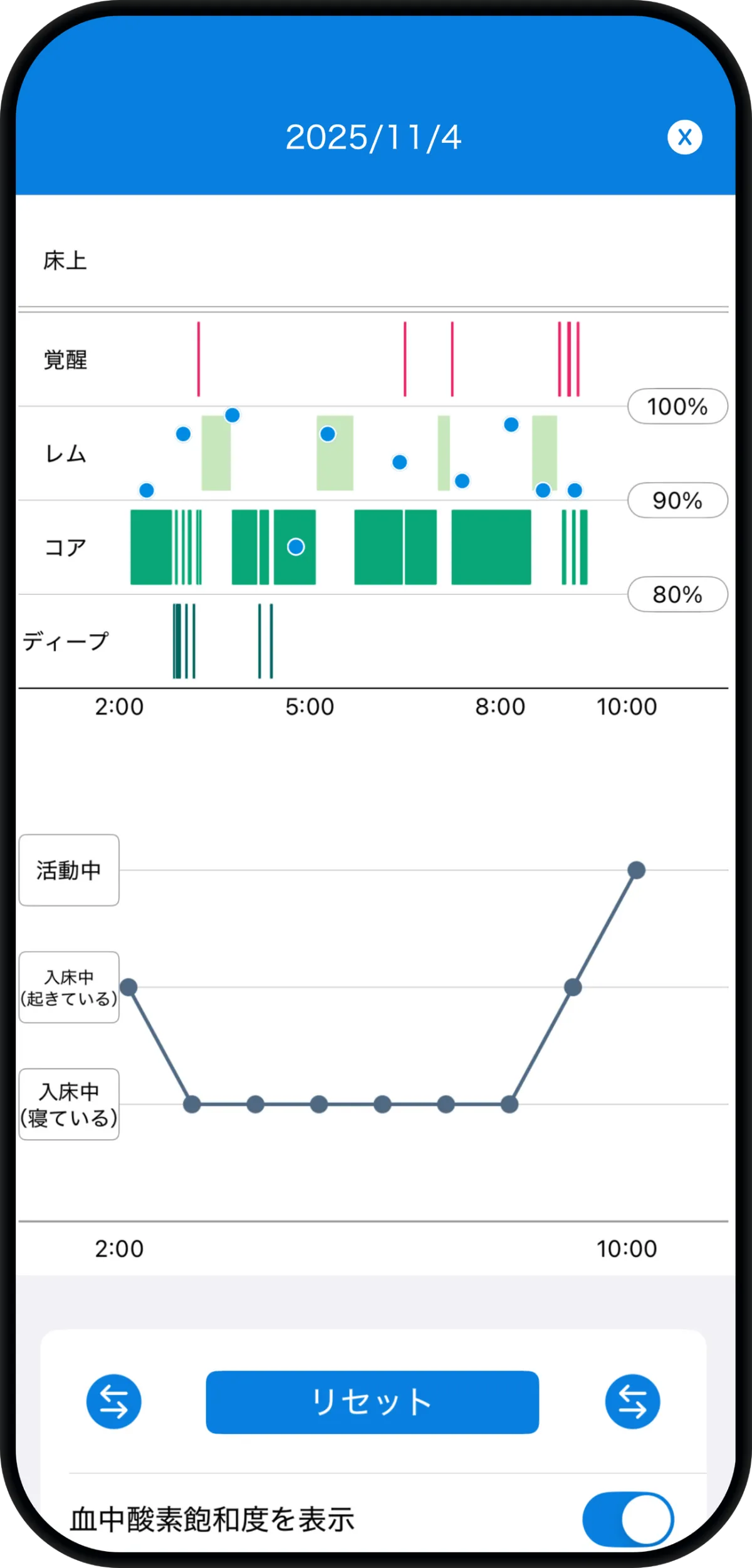 Sleepaは、Apple Watchで計測した睡眠データを「レム睡眠」「コア睡眠」「ディープ睡眠」に分類し、視覚的にグラフで表示します。この機能により、ユーザーは自身の睡眠の質を一目で把握でき、どの要因が睡眠に影響を与えているかを分析する手助けとなります。