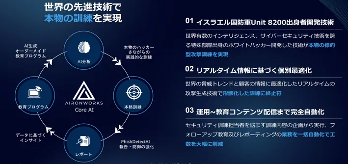 AironWorksの提供するAIメール攻撃訓練サービスは、実際のサイバー攻撃に類似したトレーニングシナリオを自動生成します。このため、単なる形式的な訓練から脱却でき、よりリアルな体験を通じて訓練が可能になります。ターゲットとなる従業員を抽出し、訓練用のメールを配信、さらにその結果をレポート形式で提供することで、情報システム部門の負担も軽減されます。継続的に訓練を行うことで、従業員のセキュリティリテラシーが高まります。