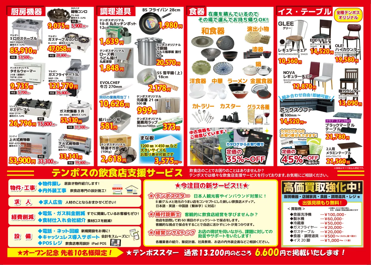 「テンポスバスターズTOC五反田」では、厨房機器や家具、食器の販売に留まらず、店舗運営に重要な服務を一括で提供します。具体的には、IT支援としてのPOSレジやキャッシュレス決済システム、人材支援、物件紹介、内外装工事、人材紹介など、経営に必要なサポートが揃っています。また、訪日外国人対応のための飲食店メディア「テンポススター」も展開しており、多言語対応が可能です。