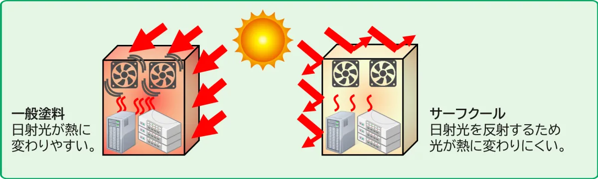 一般的な塗料は、太陽光に含まれる赤外線を受けることで、その表面温度が上昇します。特に夏季になると、この影響で建物内部の温度が著しく上昇し、空調機器の電力消費が増加する原因となります。また、熱の影響で電子機器の故障リスクも増します。これを解決するために開発されたのが『サーフクール』シリーズです。赤外線を高効率で反射する成分を含んでおり、温度上昇を抑えることができます。これまでの製品は弱溶剤系で金属腐食に強い下塗材を使用していましたが、有機溶剤を含むため施行や保管に制約がありました。