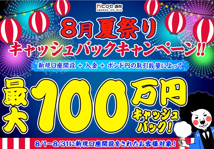 ヒロセ通商株式会社は、2025年8月1日から8月31日まで、特別なキャンペーンを実施します。「8月夏祭り最大100万円キャッシュバックキャンペーン」と題され、新規口座を開設したお客様が対象です。売買を通じて、ポンド円の取引量に応じて豊富なキャッシュバックを受け取ることができます。