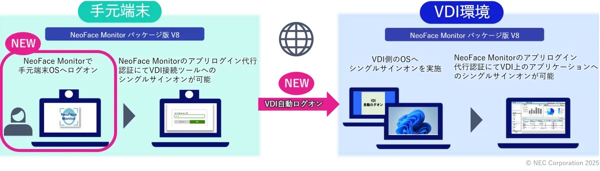新しいバージョンでは、手元端末に加えVDI環境にNeoFace Monitorをインストールすることで、顔認証がスムーズに行えるようになります。これにより、OSへのログオンや業務アプリケーションへの代行認証を同時に行うことが可能です。