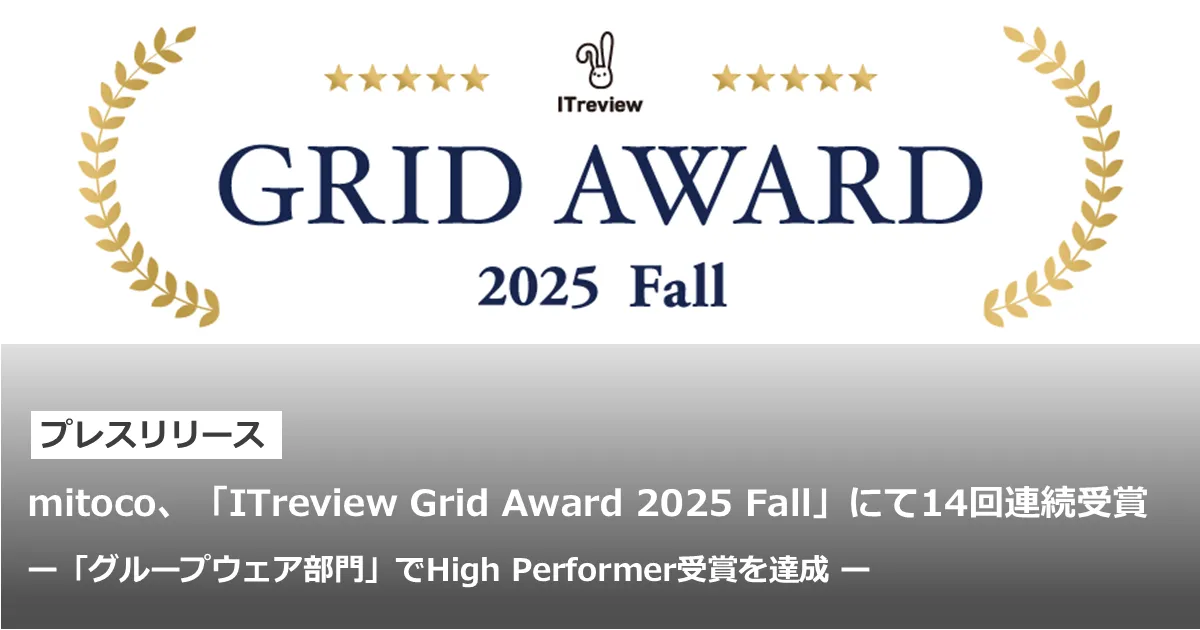 2025年10月に発表された「ITreview Grid Award 2025 Fall」では、mitocoが顧客満足度の高い製品として評価され、グループウェア部門での「High Performer」に選ばれました。この称号は、人気が高まっている製品に与えられるもので、今後のさらなる成長が期待されます。