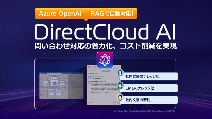 『DirectCloud AI』は、企業が保存するデータの効率的な活用を促進し、コスト削減と業務効率化を実現するAIベースのサポートツールです。具体的には、社内の文書やEメールのナレッジ化を行うことで、迅速な問い合わせ対応を可能にします。