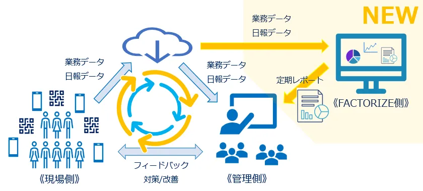 このような背景からFACTORIZEでは、データの集計と整形を自動で行い、指定したフォーマットで定期的にレポートをメール配信する新機能を追加しました。この自動配信機能によって、現場担当者は資料作成の手間を省くことができ、実務の壁を乗り越える手助けとなるのです。