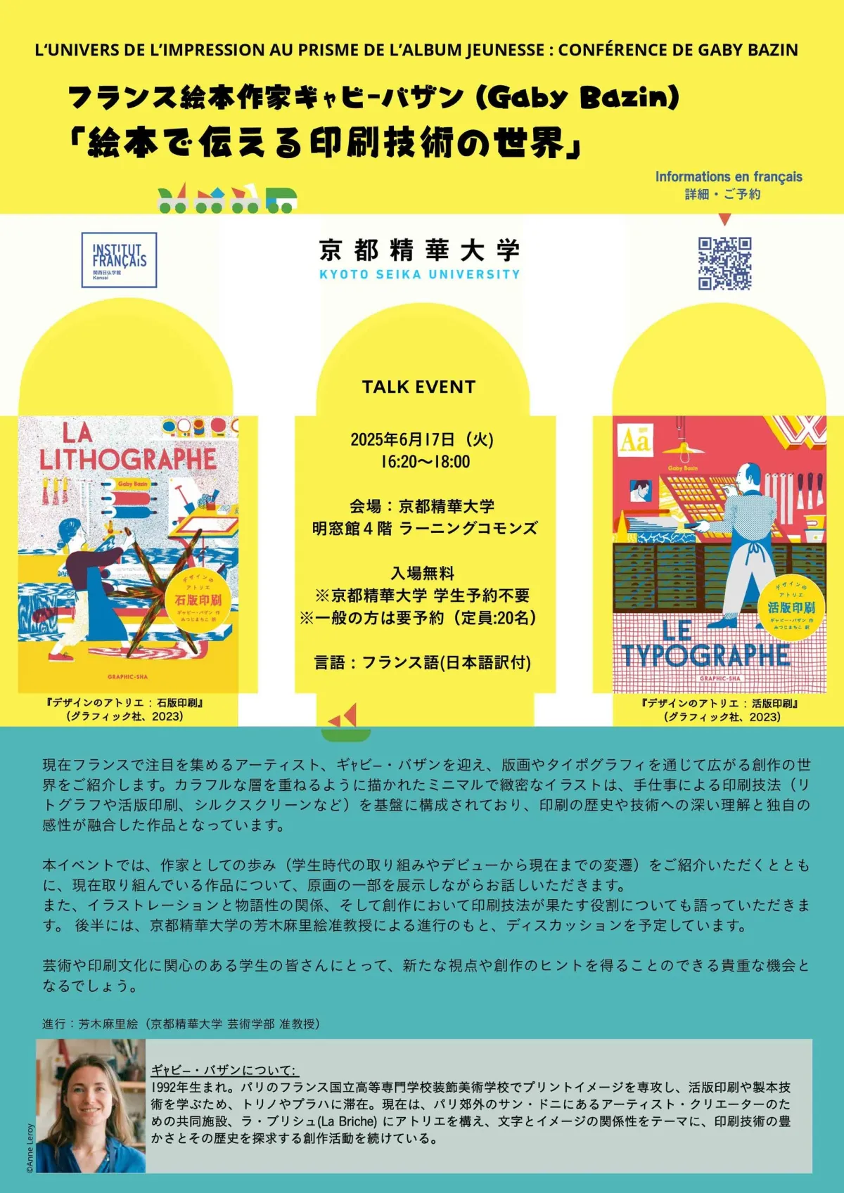 2025年6月17日、京都精華大学(京都市左京区)にて、フランスを拠点に活躍する絵本作家、ギャビー・バザン氏を招いた特別講演会が行われます。このイベントは、日仏文化交流を目的とした「関西日仏会館」との共催によるもので、版画専攻3年生のための授業「芸術社会実践実習2」が特別に公開される貴重な機会です。