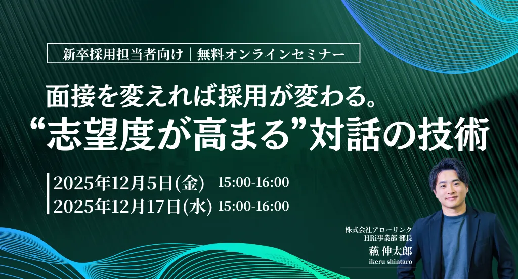 そこで注目したいのが、面接の質を高めることです。質の高い面接は、候補者の志望度を高めるだけでなく、自社の魅力をしっかりと伝えられる機会にもなります。この考え方に基づいたセミナーが、2025年12月にオンラインで開催されます。本セミナーでは、採用活動における「面接の質」を向上させる具体的な技術を学ぶことができます。