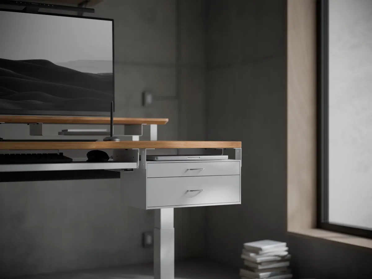 また、ミニマルスタイルとフローティングスタイルの2つの設置スタイルが用意されており、デスクのスタイルやサイズに応じて選択可能です。ミニマルスタイルでは、足元の干渉を最小限に抑えつつ、必要な収納力を確保。フローティングスタイルでは、引き出しの上部をさらに収納スペースとして活用でき、ラップトップやスマートフォンの充電スペースとしても機能します。