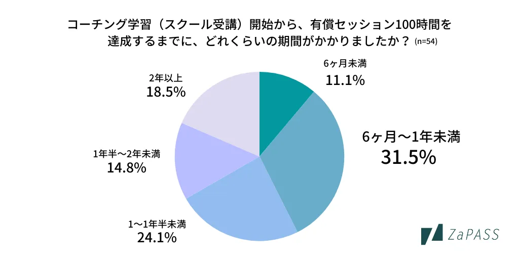 調査に参加したプロコーチの中で最も多いのは、6ヶ月から1年未満に有償セッション100時間を達成したケースでした。全体の約30%がこの期間内に目標を達成しています。一方、1年半から2年またはそれ以上かかる場合も存在し、合計で過半数のコーチが達成にそれ以上の時間を要することが分かりました。
