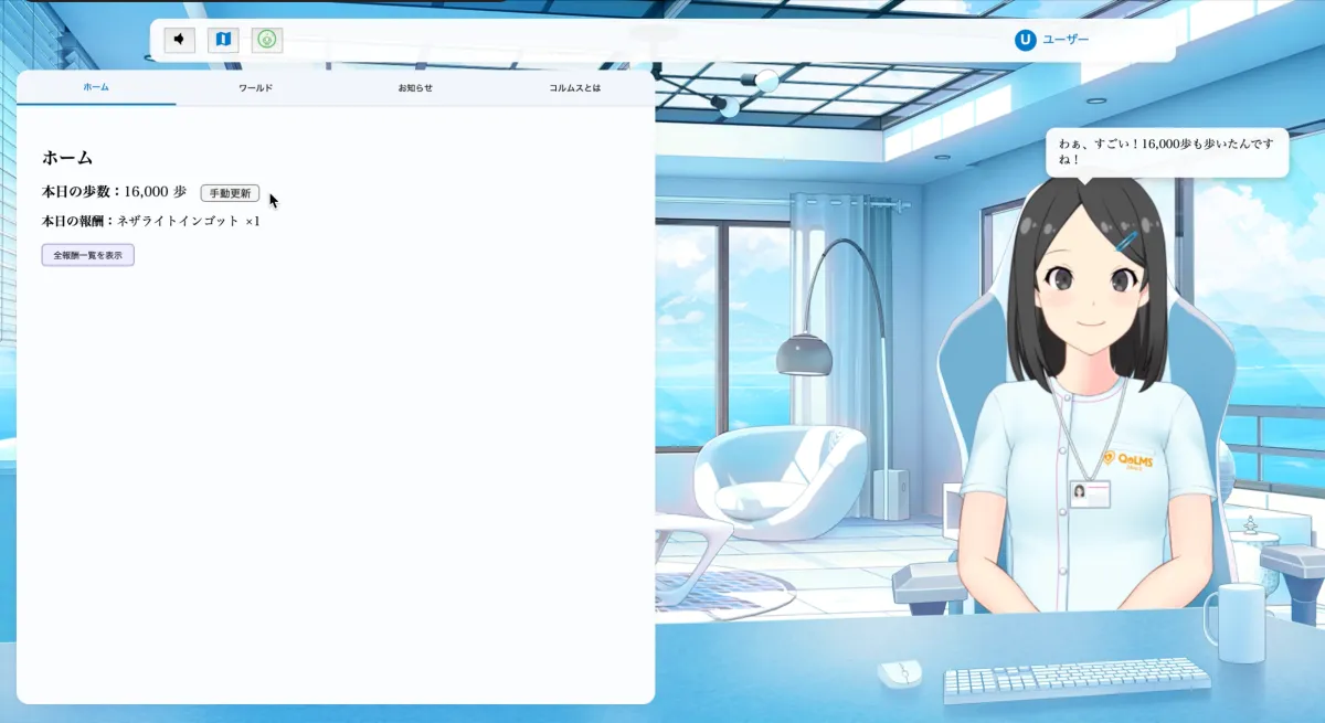 モダンホスピタルショウ2025では、PHR連携の先進事例として紹介される「QOLMS」のデモ体験が用意されています。来場者は、実際に稼働するサービスとの関係性を「触れて・確かめて」体験できる機会を持ちます。この展示では、単なる説明ではなく、医療DXの実効性を実感できる場となっています。特に、参加者が歩数を更新することでアイテムを取得し、キャラクターから激励のコメントをもらう仕組みがあり、楽しみながら健康管理を促進することができます。