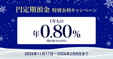 対象期間は2025年11月17日から2026年2月8日までで、個人名義の口座を持つお客さまが対象です。ただし、法人名義のお客さまはこのキャンペーンの対象外となります。お預入れにあたっては、年0.80%の金利が適用され、税引後は年0.63%となります。