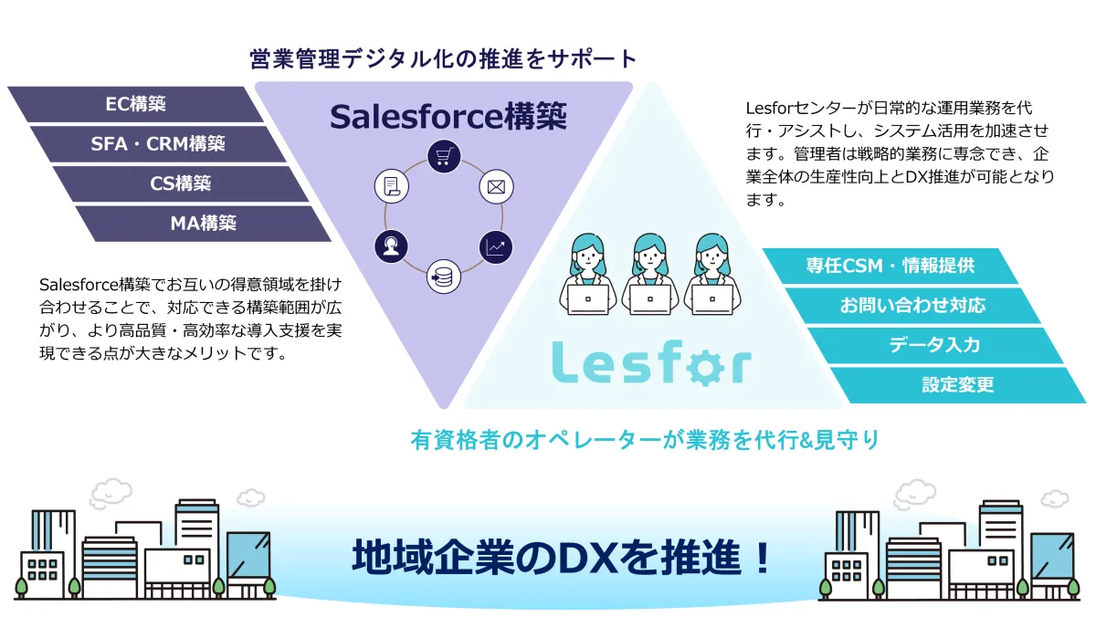 両社のコラボレーションは単なる業務提携に留まらず、地域企業に対する強力な後押しとなります。特に、Salesforce管理者アシストサービス「レスフォア」を通じて、顧客企業のSalesforce活用を加速することで、運用業務の効率化が図られます。これにより管理者は戦略的な業務に専念でき、全体の生産性向上にもつながります。